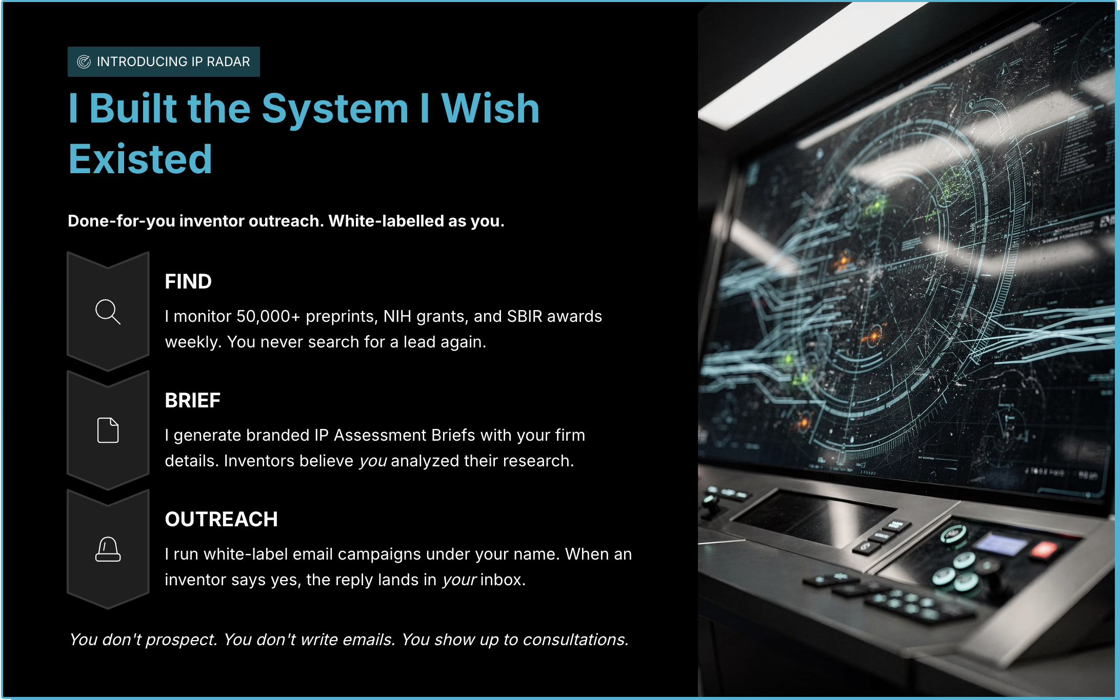 Wednesday: With one click, you generate personalized IP Assessment Briefs for all three. The system sends white-labeled outreach that same day.